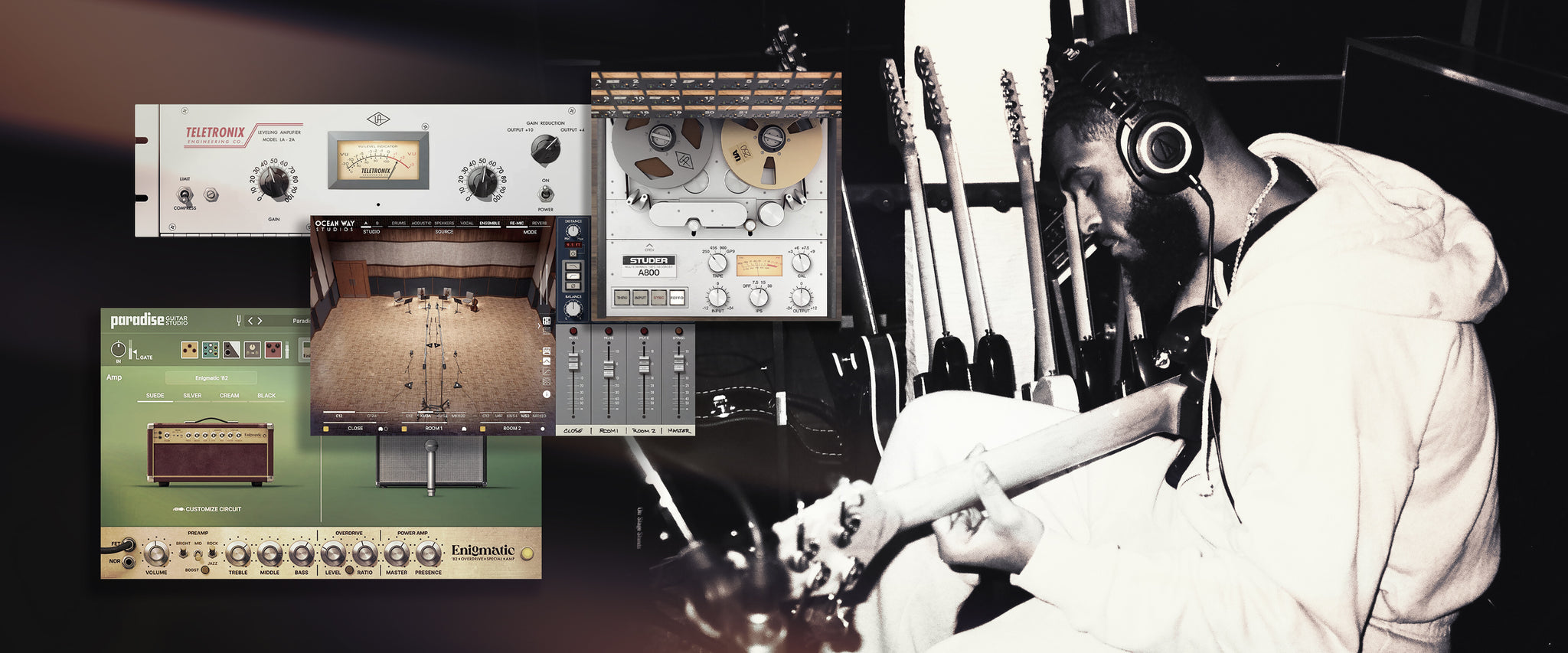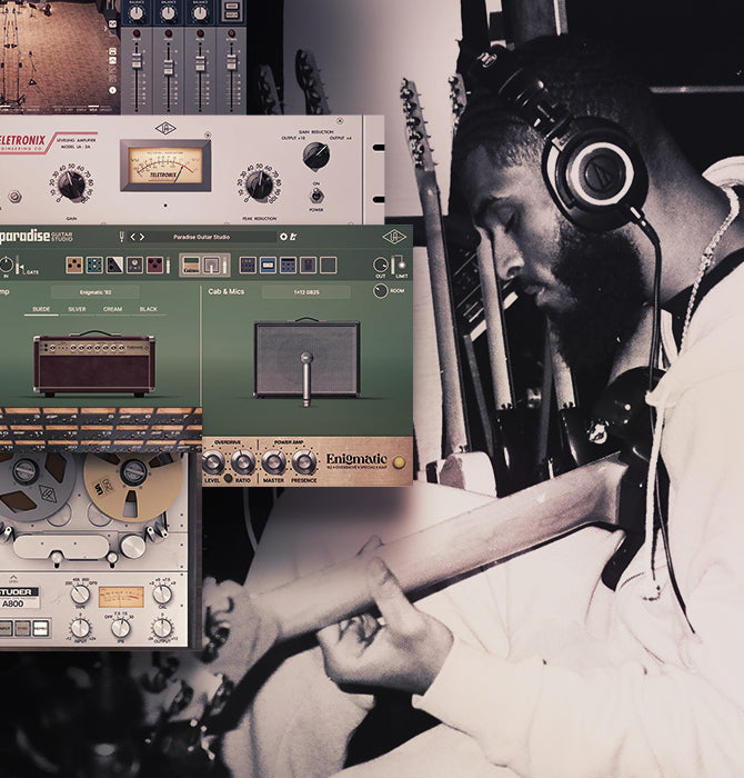 Getting the right base tone is essential when using guitar in hip-hop production. Amp emulator plug-ins like those found in UAD Paradise Guitar Studio allow you to get the sound of classic tube amps used by pro guitarists, without plugging into a real amp.